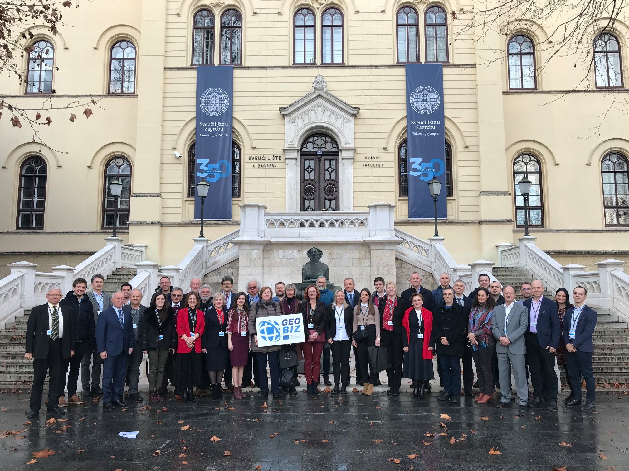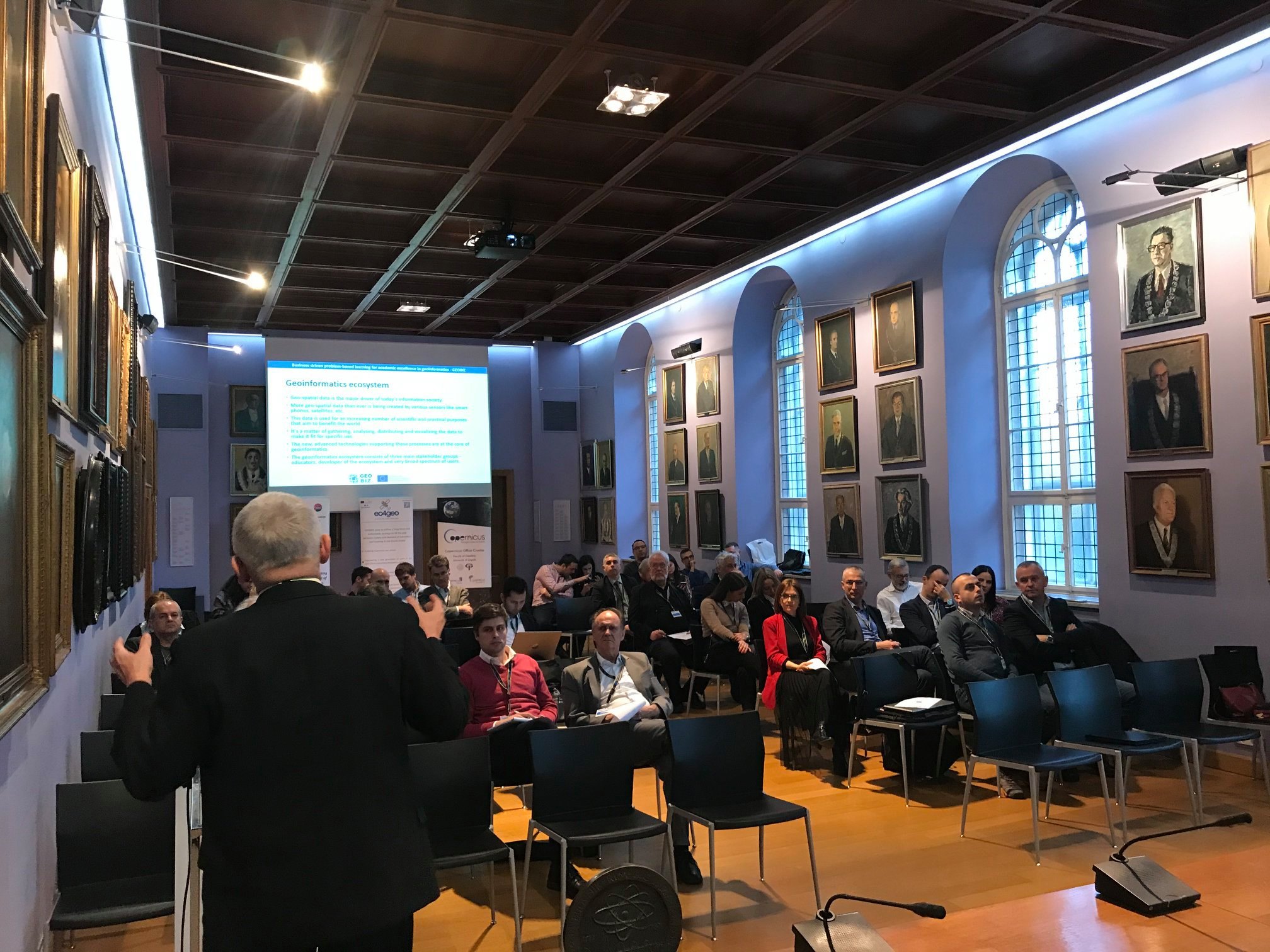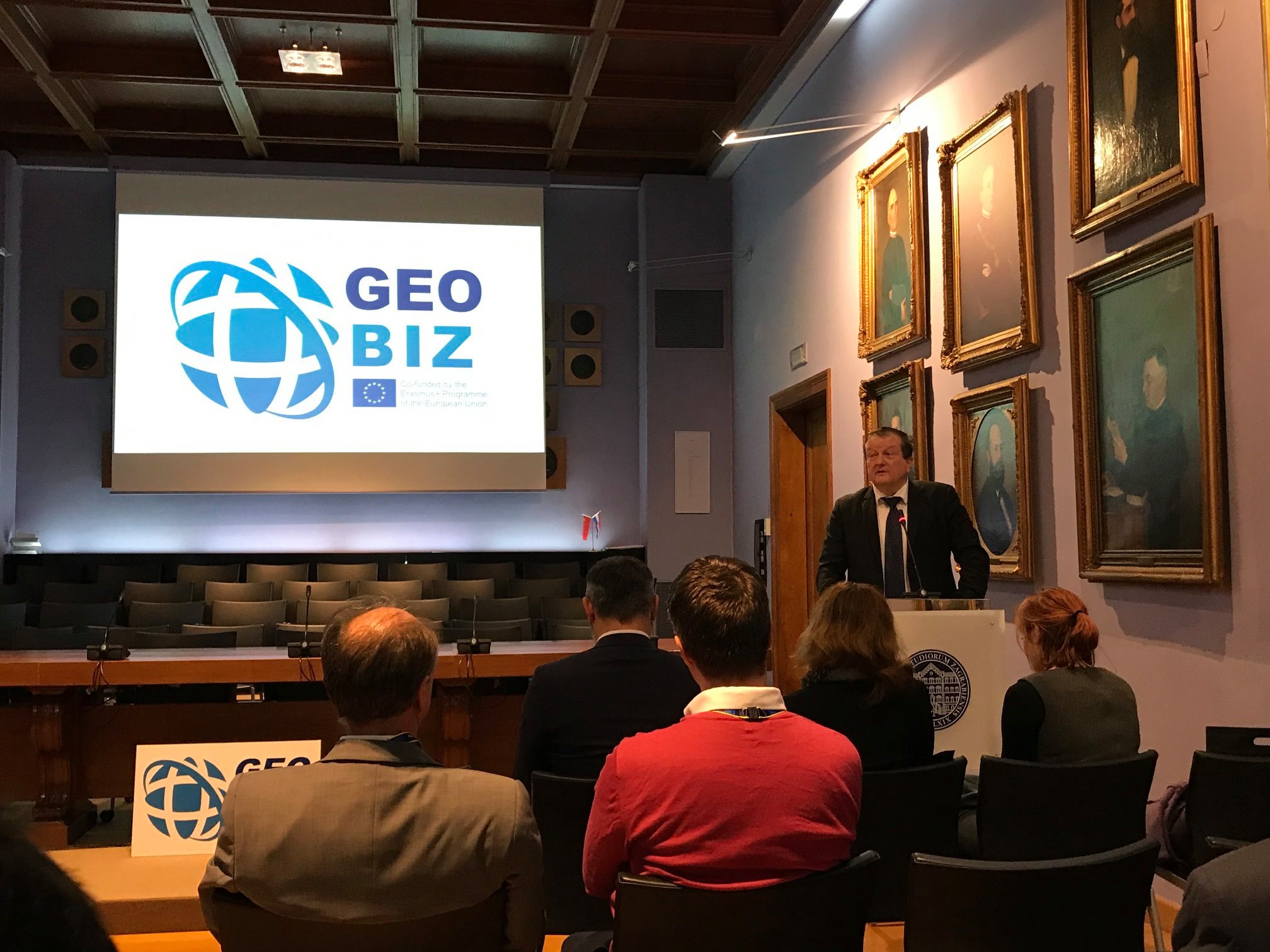 The official start of Erasmus + KA2 Capacity Building in Higher Education project GEOBIZ was November 15th 2019, but it was inaugurated on February 4th , 2020 in the Rectorate Aula of the University of Zagreb within the frame of the first project workshop – kick-off meeting. More than frothy project consortia participants together with the representatives of the University in Zagreb, Croatian Agency for Mobility and European Union Programs (AMPEU) and other local and international entrepreneurs attended the project launch and after the welcome speeches of the guests of honor, Prof. Damir Boras, PhD (Rector of the University of Zagreb), Antonija Gladović, M.Sc. (Director of the Agency for Mobility and EU Programmes, AMPEU) and Prof. Almin Đapo, PhD (Dean of the Faculty of Geodesy) they received the first information about the project from the project coordinator, Prof Željko Bačić, PhD, from the Faculty of Geodesy, University in Zagreb.